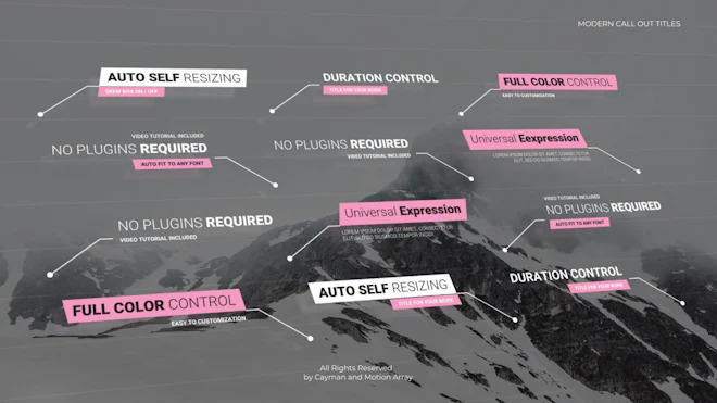 Call Outs Auto Scale is a versatile After Effects template that contains 24 clean, clear and creatively animated full-screen title animations. They're so easy to use, simply edit the text, adjust the colors and hit render. You can add them into your presentations and slideshows. Download this fantastic AE template today and make cool looking full-screen title animations for your videos. No plugins required. A detailed video tutorial is included.
