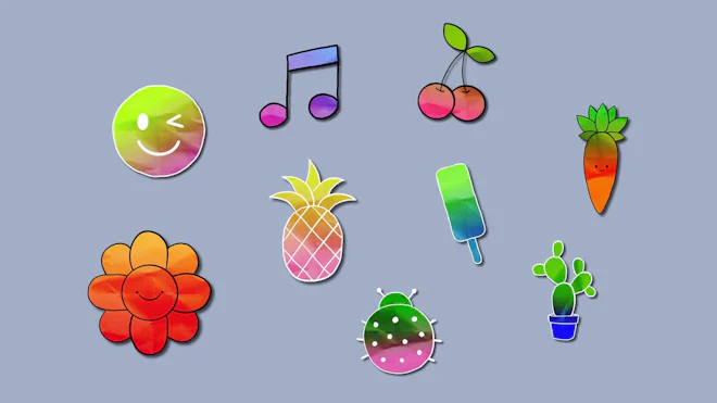 This After Effects template features 9 colorful stickers in the stop-motion cartoon style. You can edit the colors to create your style. Use them in your future projects. Check it out today! A video tutorial is included. Available in 4K.