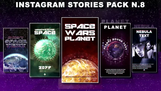 Instagram Stories Pack N.8 is an extraordinary After Effects template. It contains 5 cool looking vertical designs that are totally out there. They're so easy to use, simply edit the text, drag and drop in your new media and hit render. You can use them to create a space-themed video. Impress your audience with this up to date and dynamically animated AE template. No plugins required.