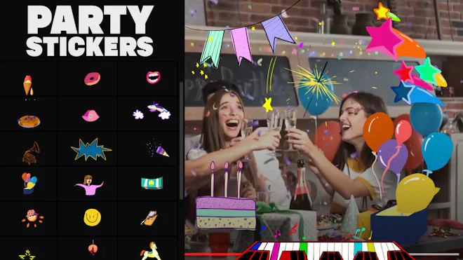 This stock motion graphics video pack includes 25 different clips of hand-drawn cartoon party stickers on transparent alpha channel backgrounds in seamless loops.