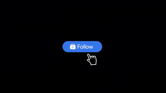 A 2d cartoon icon animation featuring a Follow button being clicked with entry and exit animations on a transparent alpha channel.