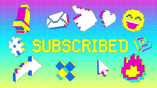 This stock motion graphics video pack includes 42 different clips of pixel cartoon icons and titles on a transparent alpha channel in a seamless loop.