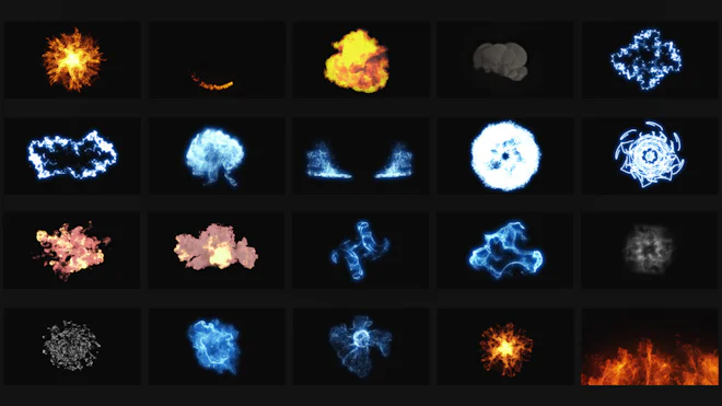 This stock motion graphics video pack includes 30 different action effect overlays including energy bursts, explosions, flames, and shockwaves on transparent alpha channels for easy drag and drop.